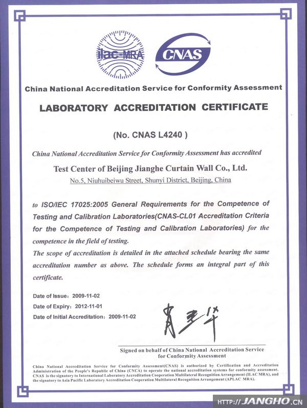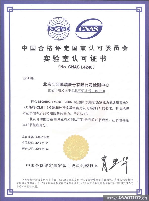 11月2日,,,,,,北京麻将胡了PG幕墙股份有限公司检测中心正式获得中国及格评定国家认可委员会CNAS实验室揭晓的认可资质证书,,,,,,标记着麻将胡了PG幕墙检测中心顺遂通过了国际ISO17025标准的认可,,,,,,综合检测能力获得行业组织的国家认可,,,,,,成为海内幕墙企业首家通过CNAS评审的出口企业检测中心,,,,,,并乐成列入国家获准实验室认可机构名录。 。 。。。。以后,,,,,,检测中心可在认可检测规模内使用CNAS实验室认可标记和ILAC国际互认团结标记,,,,,,并有时机加入国际及格评定机构认可双边、多边合作交流。 。 。。。。